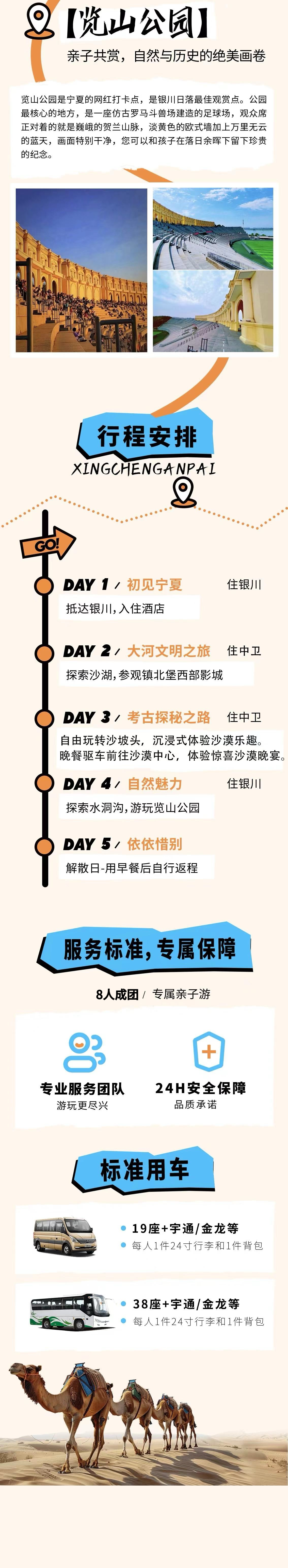 集合日,欢迎来到宁夏,开启您的亲子之旅!我们的行程是在宁夏银川集合,请您自行抵达。酒店办理入住手续的时间为14:00后,您在酒店前台出示入住人证件即可办理入住手续,我们的工作人员也会在当日与您联系。