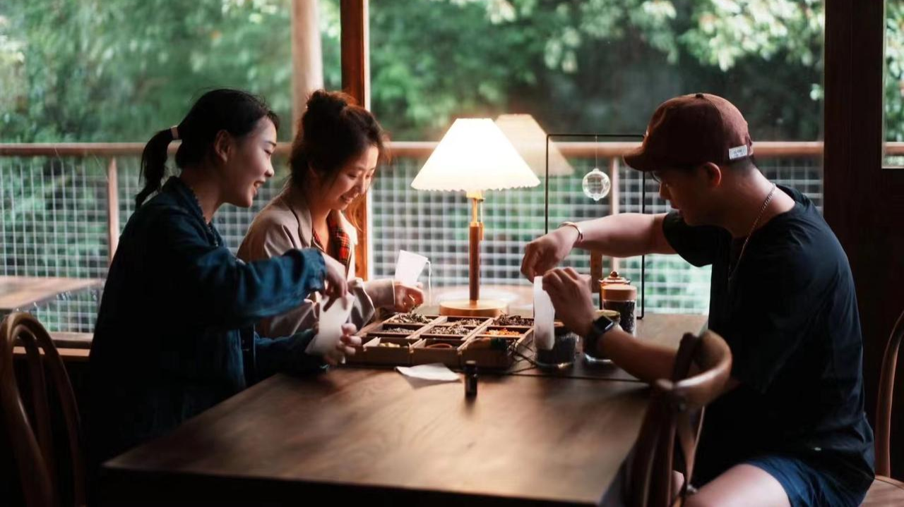 您可选择在屋内、露台或树下和朋友喝茶聊天,下午3点半到4点我们会提供红糖醪糟或醉⾖花。