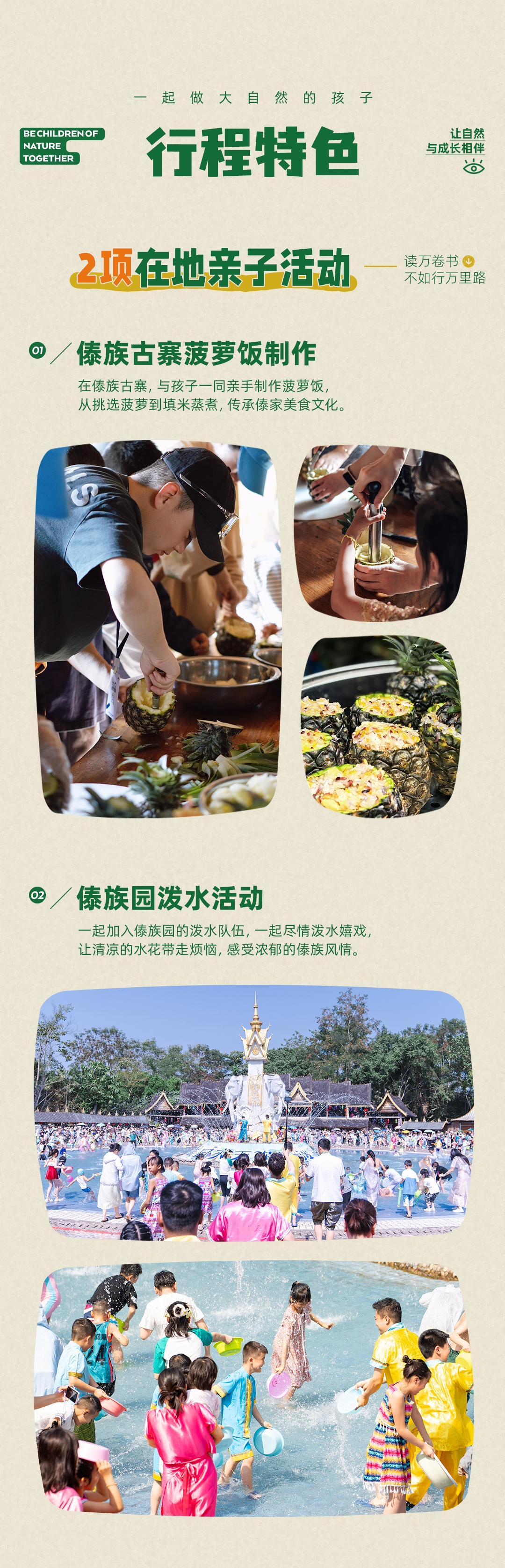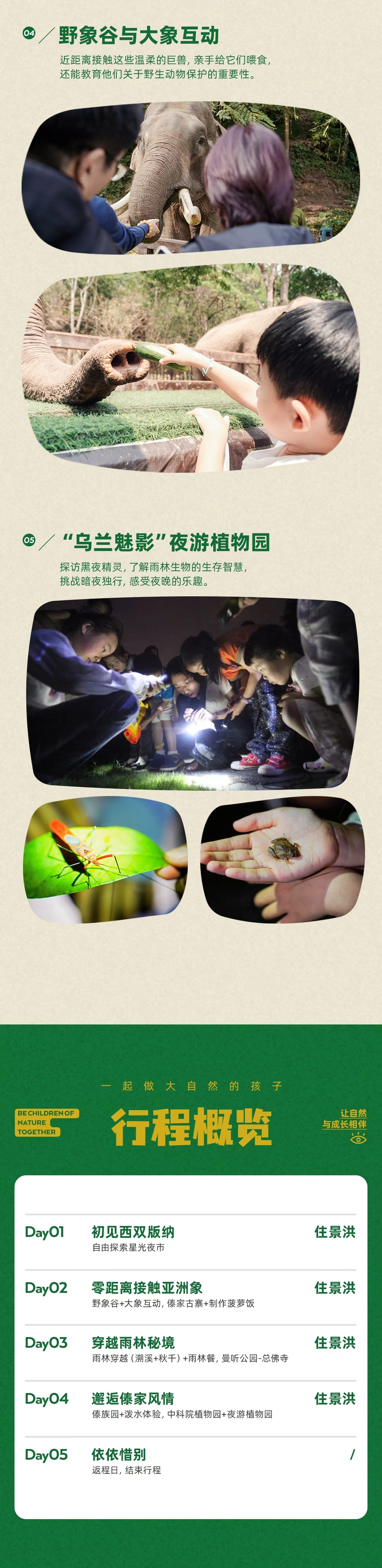 4. 活动:雨林穿越+傣寨体验(制作菠萝饭赠送项目,不体验不退费)+小象互动(喂食)+夜游植物园(冬季版纳旅游旺季,如夜游预约不上退还相关活动费用)。